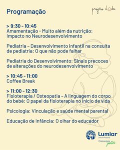 Este evento gratuito e aberto à população contará com a presença de especialistas na área do desenvolvimento infantil. Para maior comodidade dos pais, haverá um espaço dedicado para as crianças brincarem durante o encontro. A marcação prévia é necessária para uma melhor organização. INSCRIÇÃO.